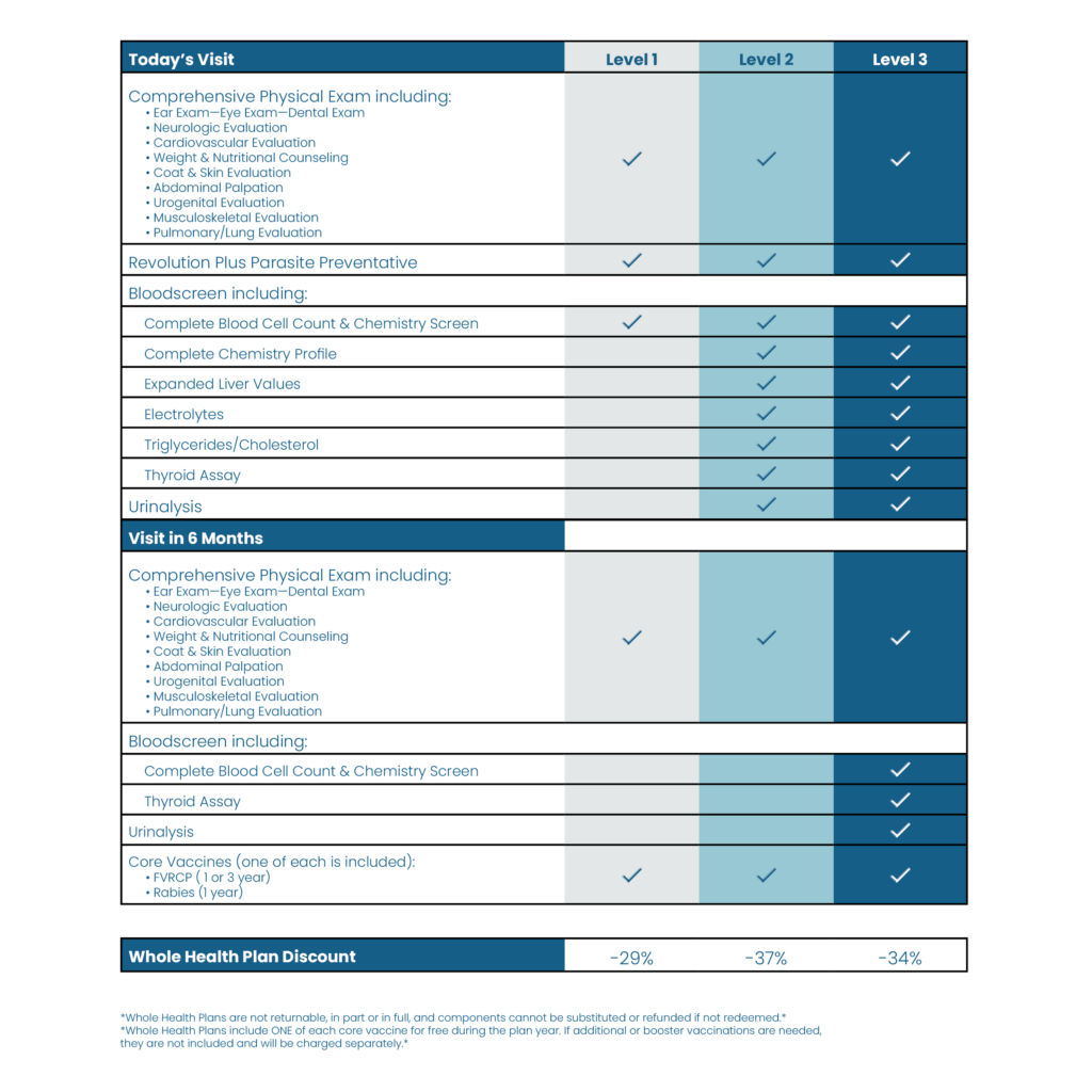 Each plan focuses on four essential cornerstones of preventative pet health care: Exams, Lab Tests, Parasites, and Vaccines.