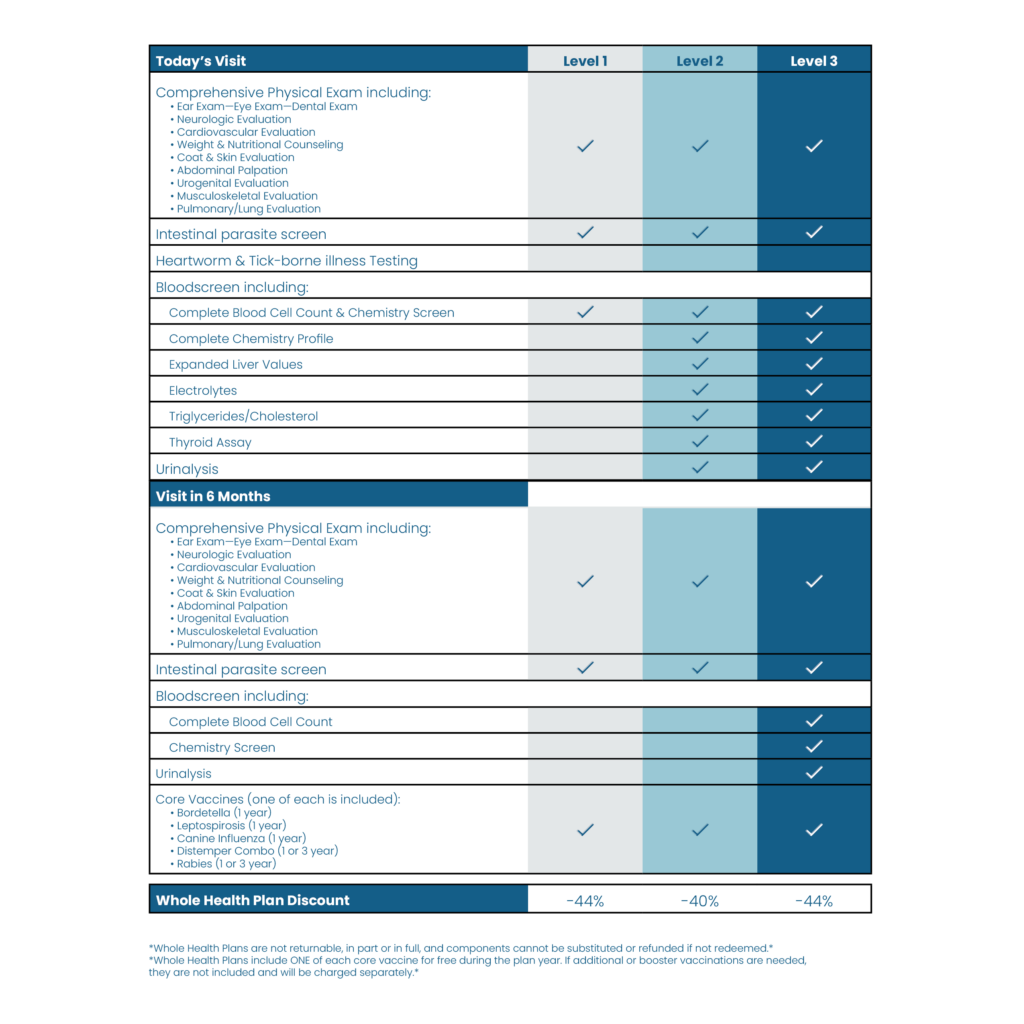 Each plan focuses on four essential cornerstones of preventative pet health care: Exams, Lab Tests, Parasites, and Vaccines.